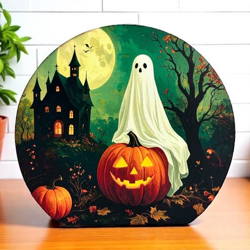 Ghost on Pumpkin - Wood Halloween/Autumn Decor Circle Sign