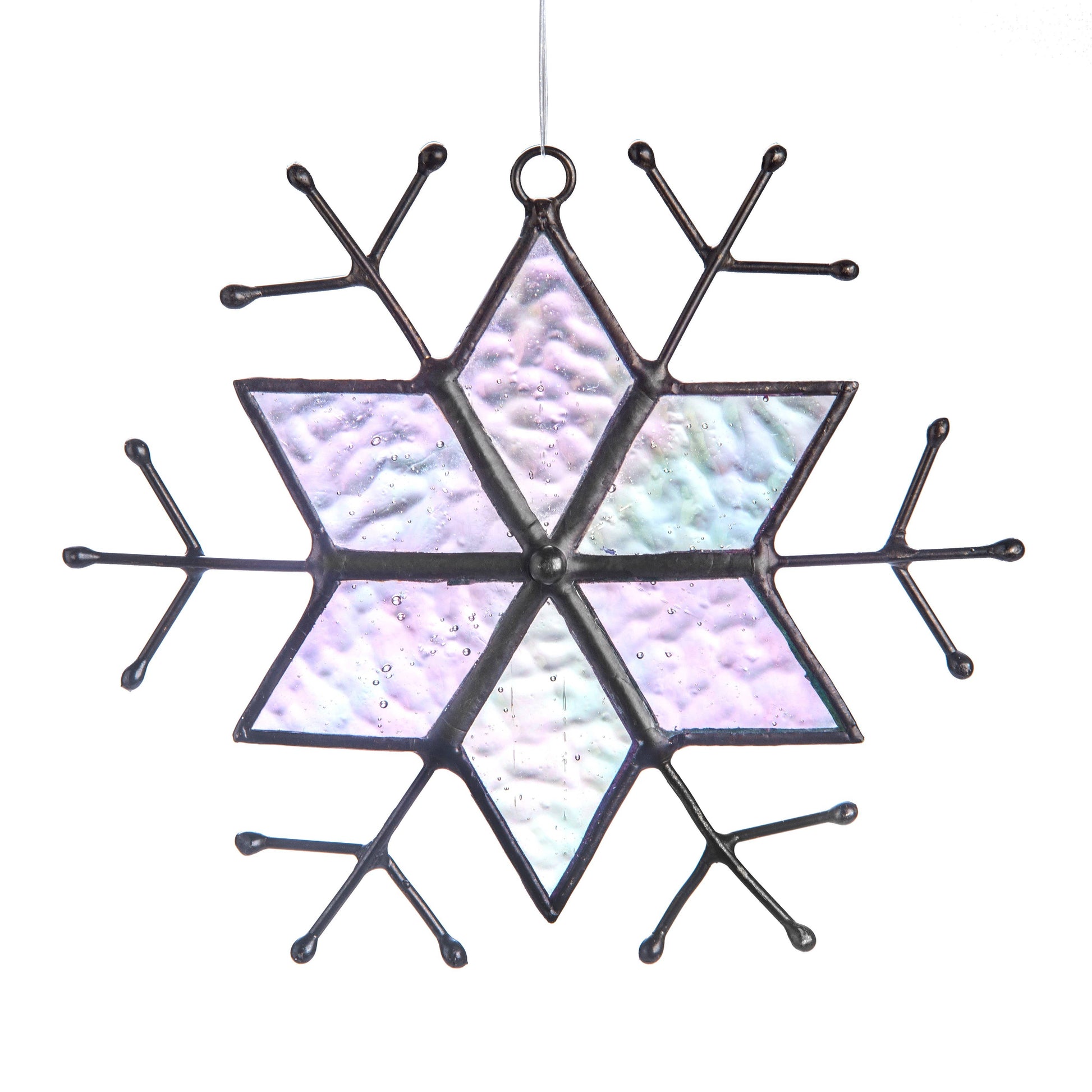 Bring sparkling color inside during cold winter days with this festive glass snowflake. Featuring a center star made of clear hammered iridescent glass, decorate your Christmas tree with this delicate snowflake and afterwards display in your window with the suction cup that is included.