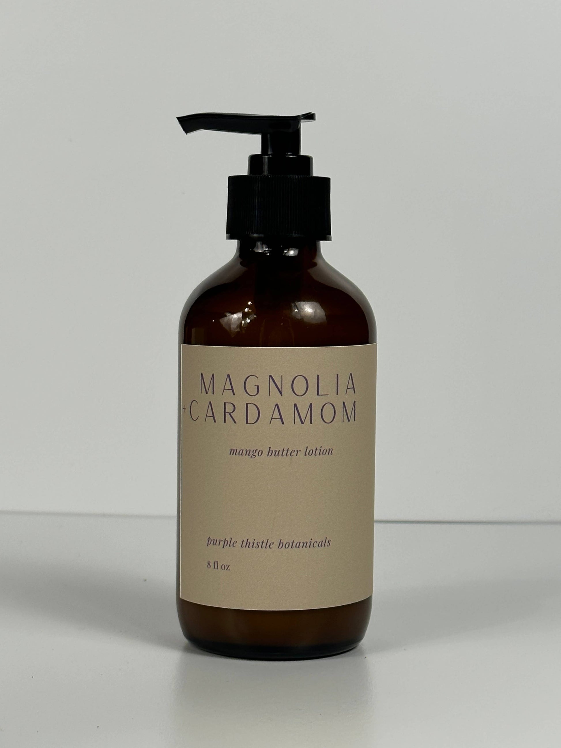 Our daily-use lotions are formulated using quick-absorbing Sunflower Oil and ultra-softening Mango Butter, and are created so as not to leave an oily feeling behind after use. Aloe Vera Juice and vegetable derived Glycerin bring moisture to the skin, and the Mango Butter acts as an occlusive to hold it there. This lotion is is deep and complex, with notes of bergamot, cardamom, black pepper, magnolia, and vanilla.
