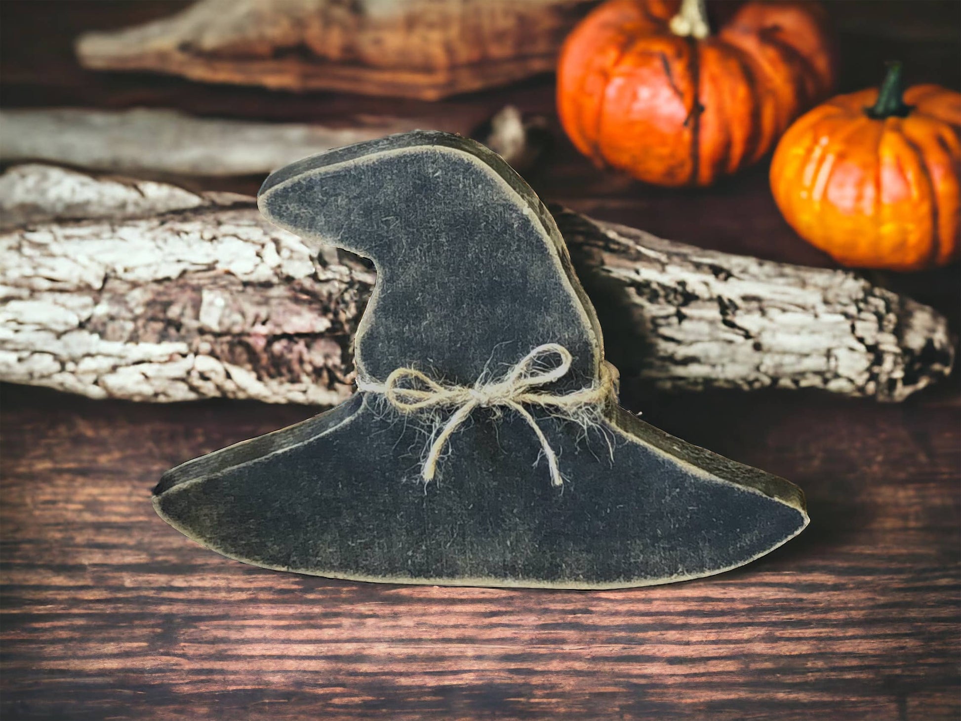 These wood witch's hats are the perfect addition to your shop's Fall décor. Made out of 3/4" MDF, painted and lightly sanded for a primitive look . *No two hats will be exactly the same