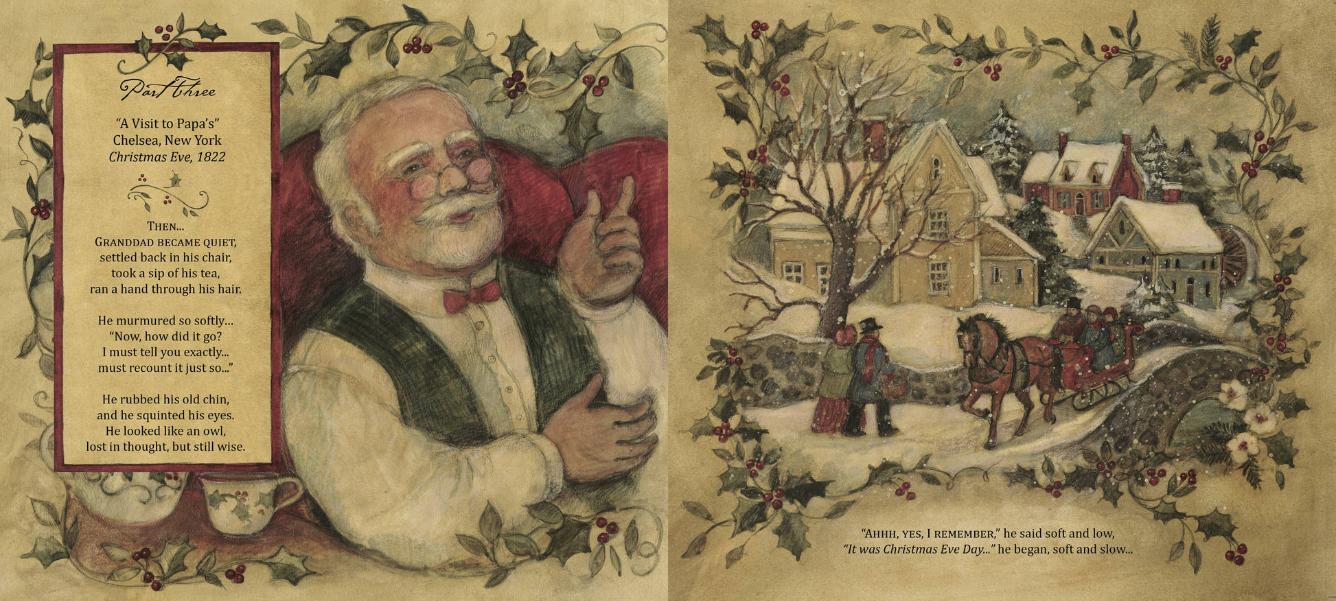 It is based on the history of the poem as passed down through the generations of the Moore family and told to the author by Dinghy Sharp, the great-great-granddaughter of Clement Moore. Not only does the story of the beautiful and enduring poem's creation unfold in this tale, but many of the terms and actions of the characters in "The Night Before Christmas" are explained, including why stockings were hung.